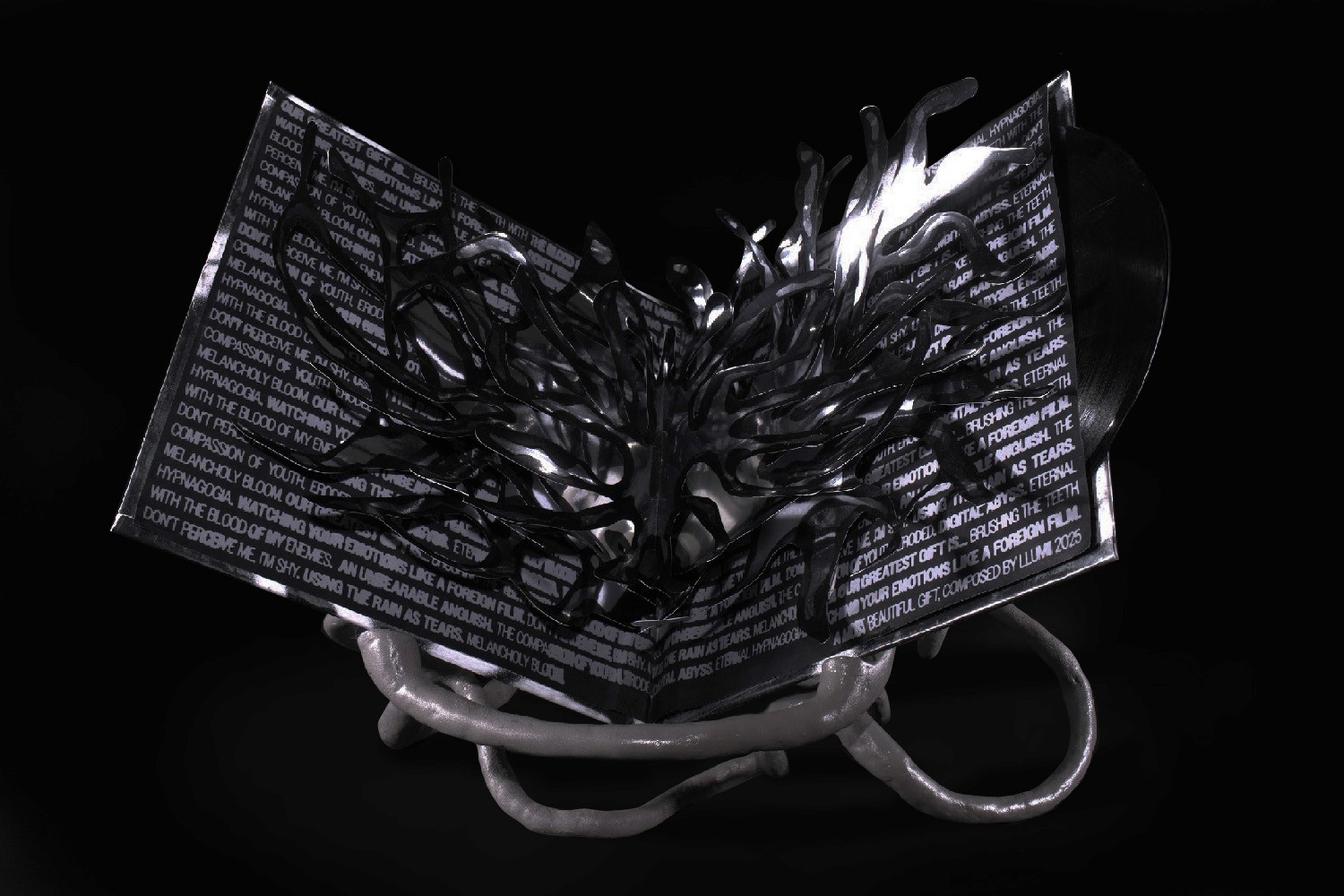Vinyl & Cover: Taking the structure of a vinyl jacket, and expanding on traditional appearances. An album cover is a crucial factor to help represent the chosen music through visual practices. Features such as paper engineering can be incorporated inside the vinyl, to develop the narrative of the album through.