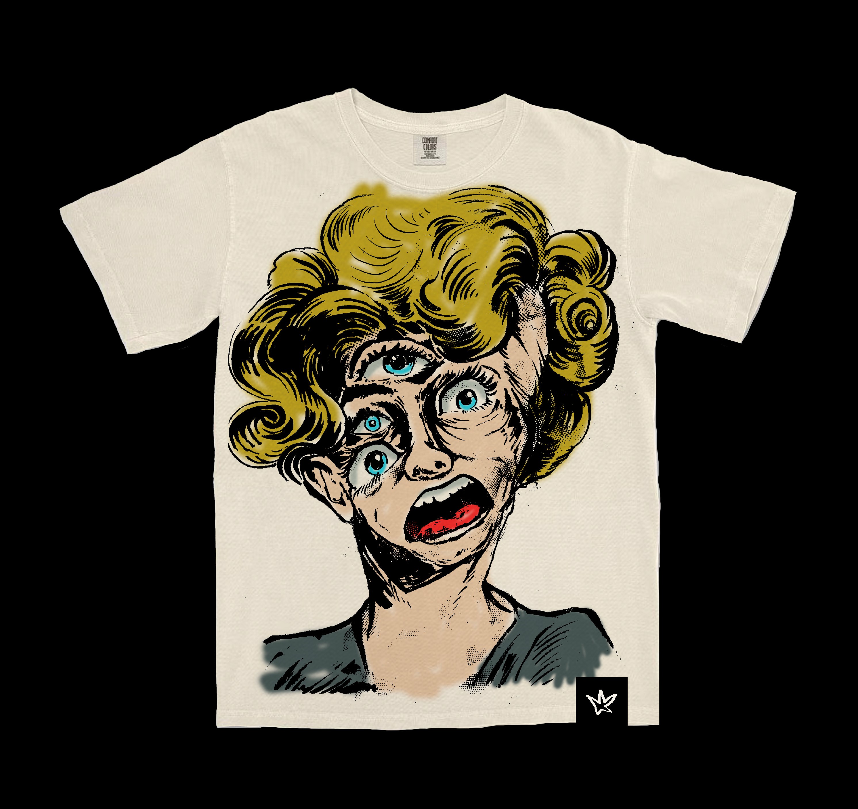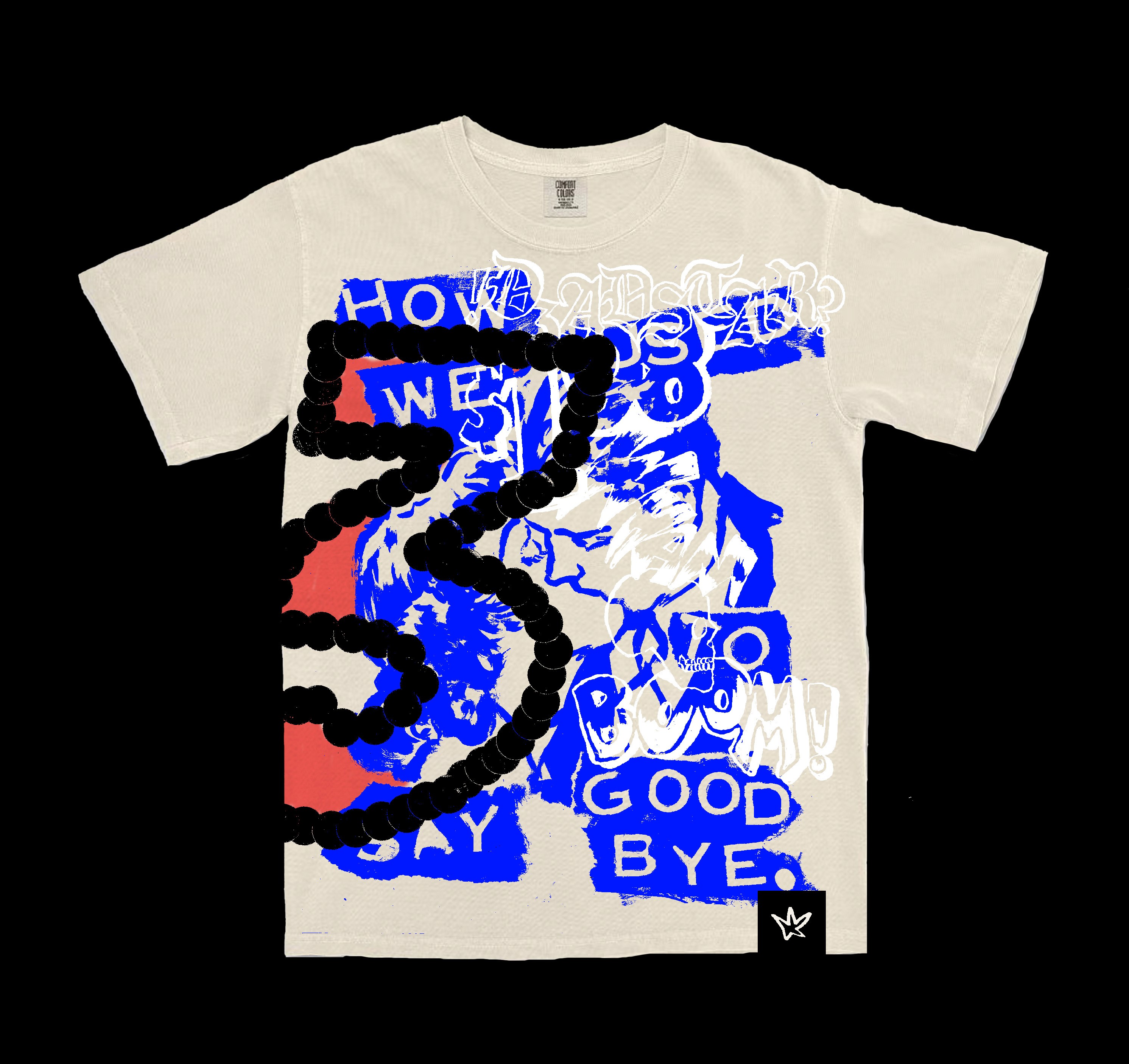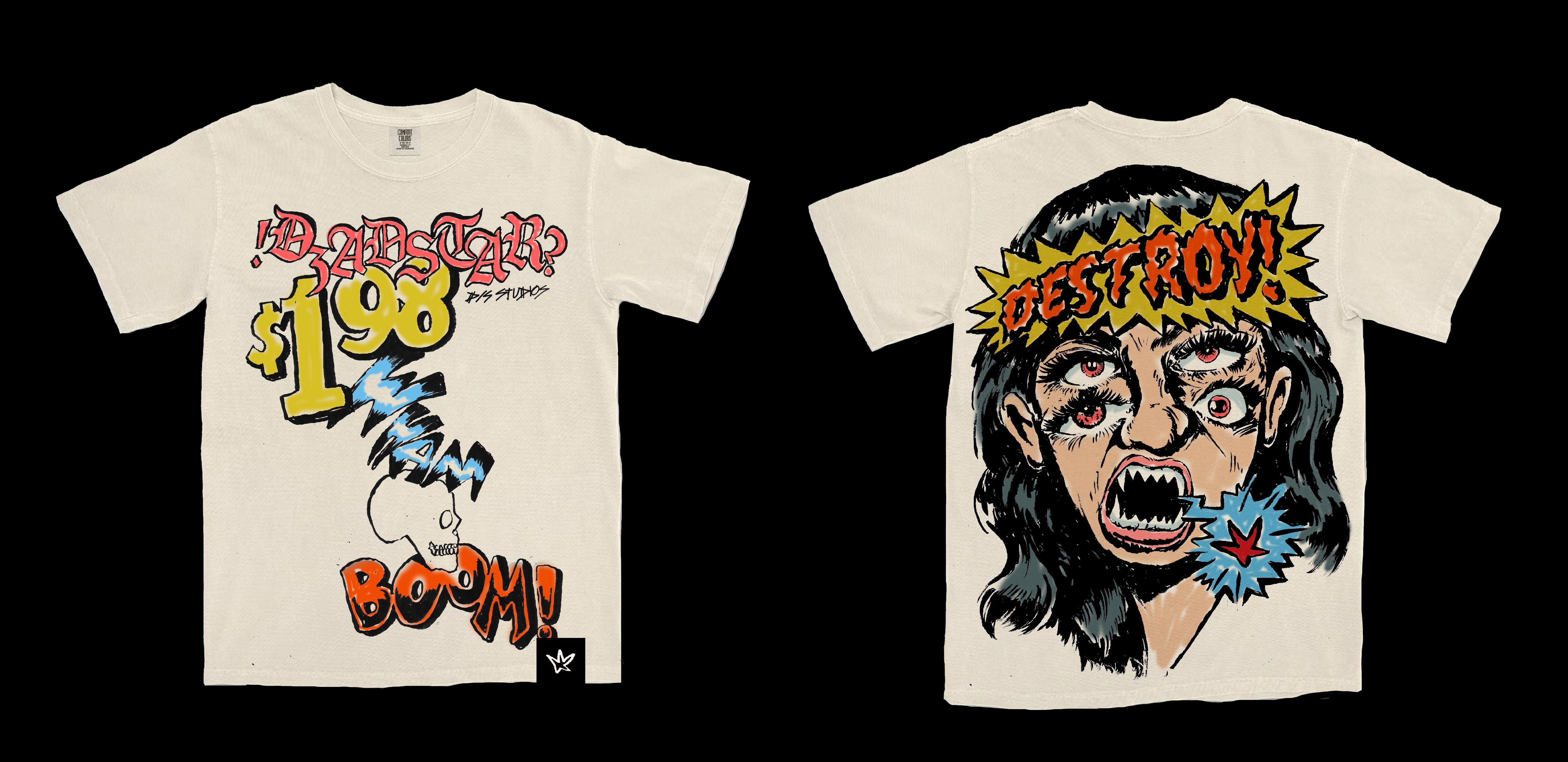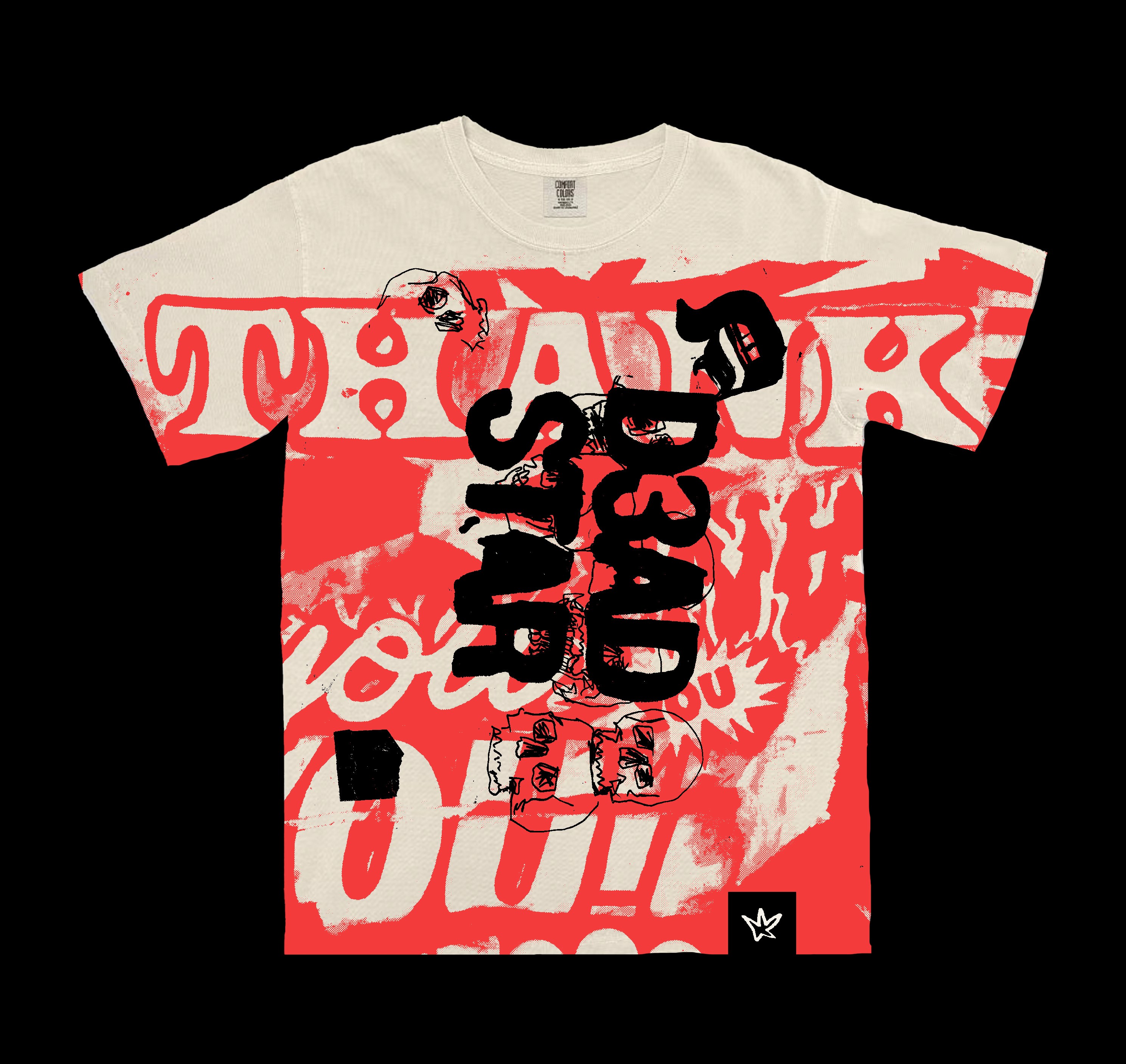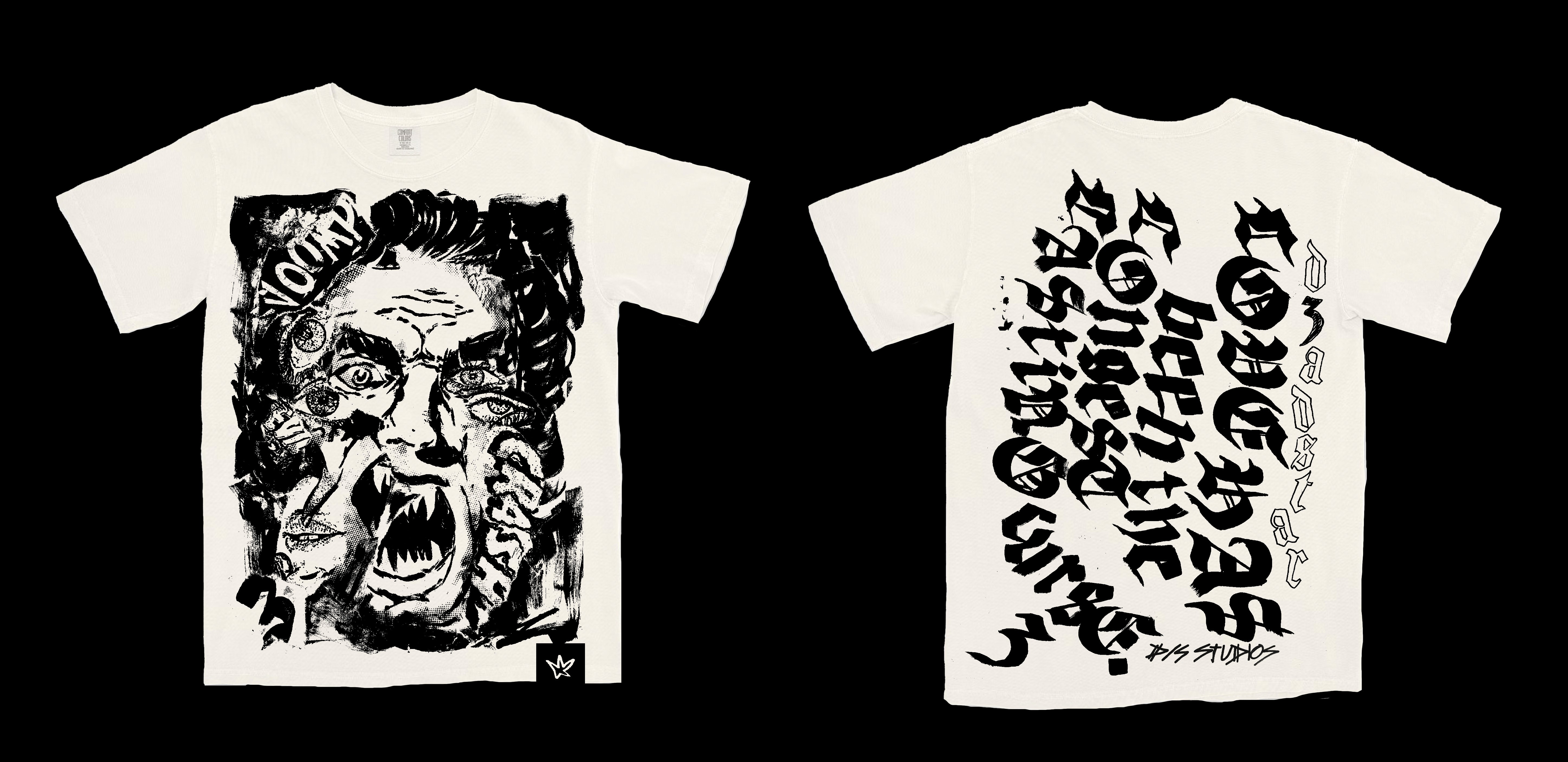 Hand-drawn, illustrated designs for personal t-shirt collection. Uses of large prints, overlapping prints, airbrush, & other inclusions.